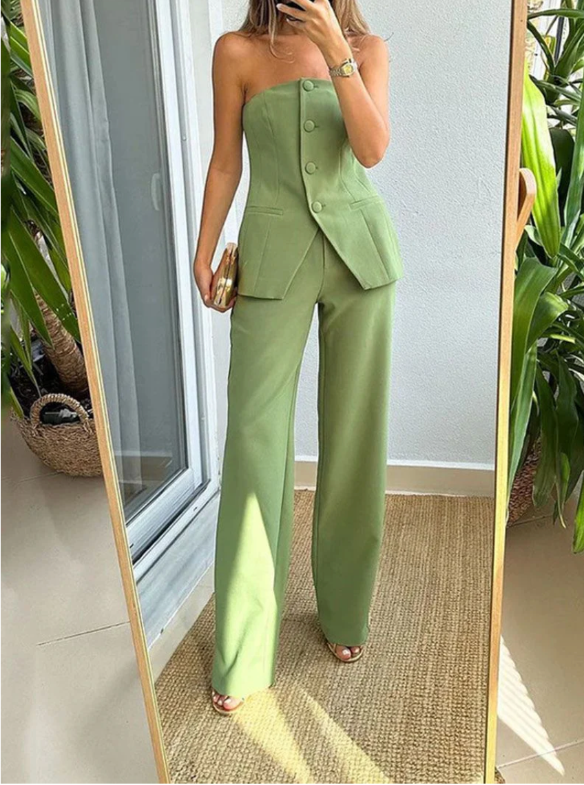 Effortlessly chic and modern, this two-piece set features a structured, strapless top with bold button detailing and a flattering, asymmetrical hem that defines the waist. The coordinating high-waisted, wide-leg trousers create an elongated silhouette that moves gracefully with every step. Crafted in a smooth fabric, the Amalia™ Strapless Two Piece exudes understated elegance — perfect for brunches, garden parties, or sophisticated evenings out.